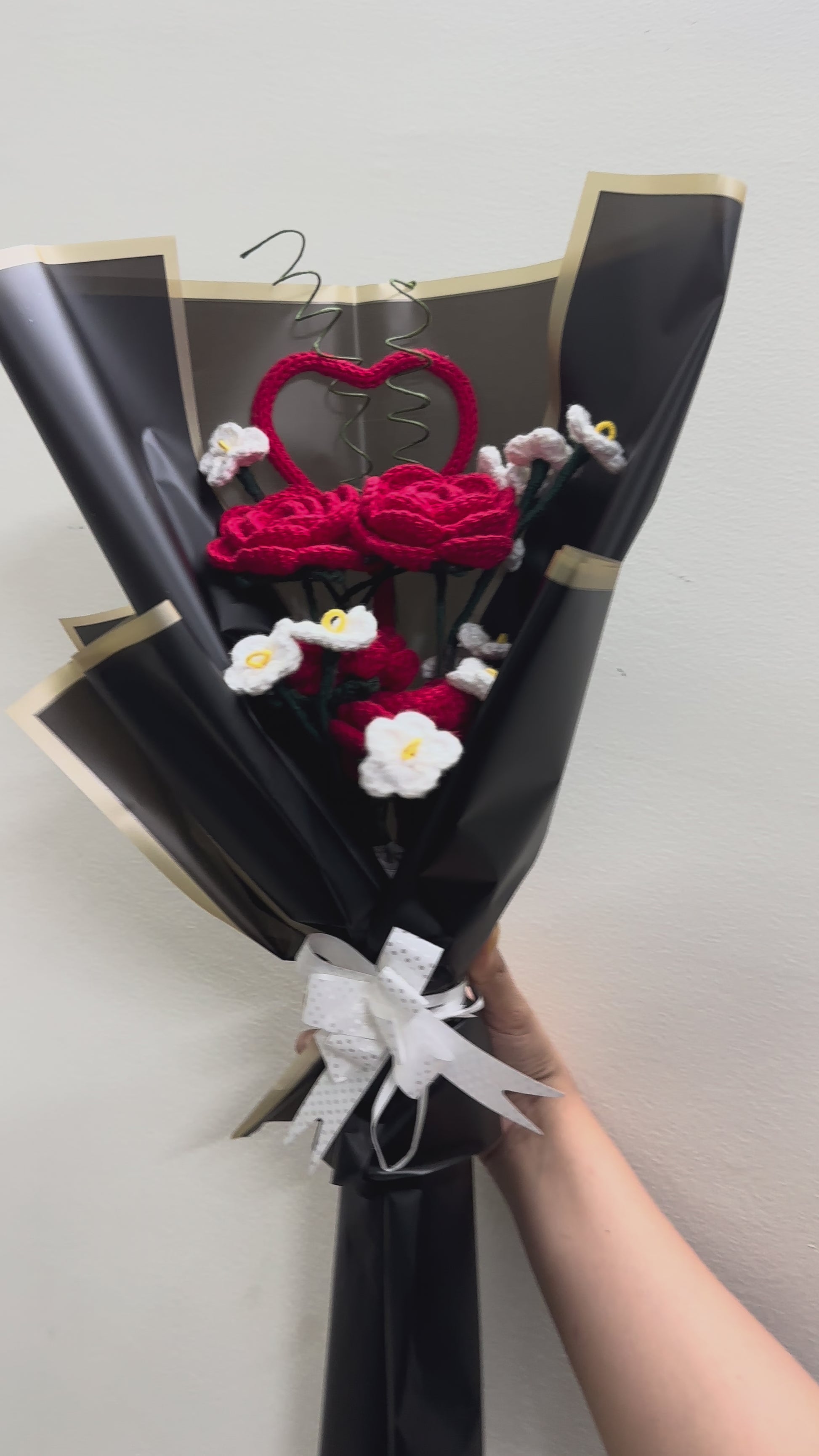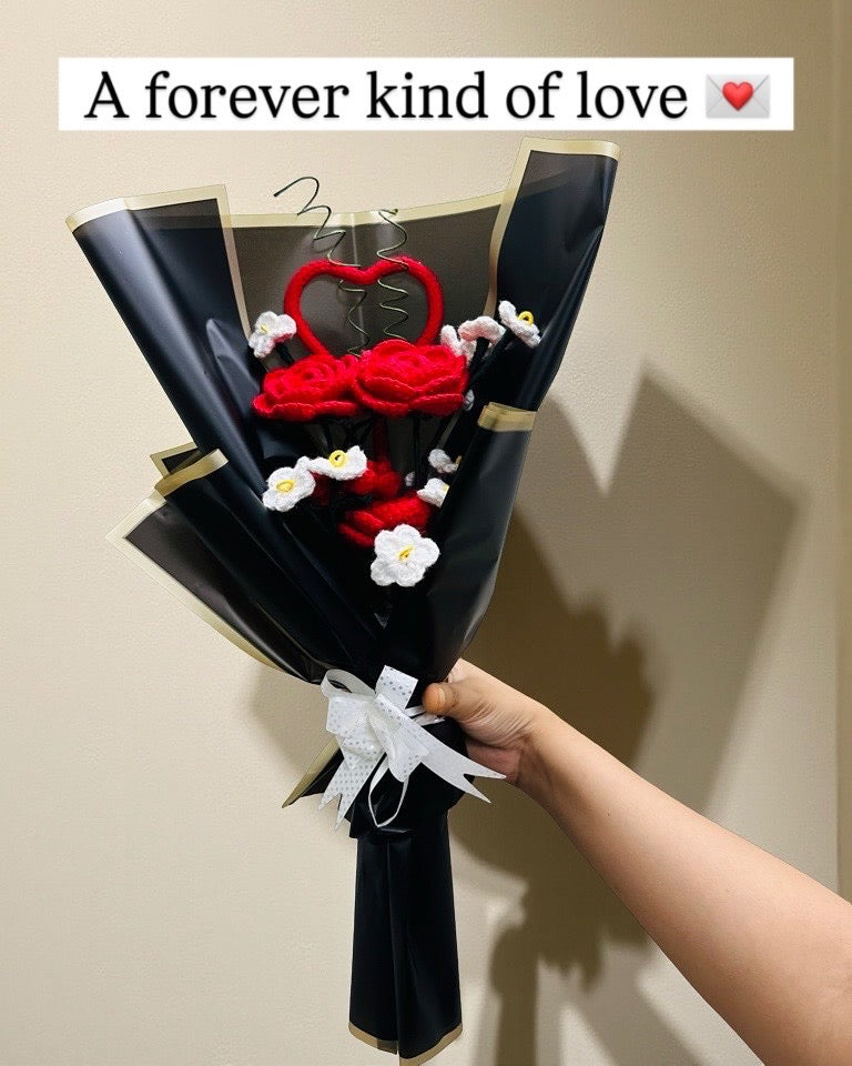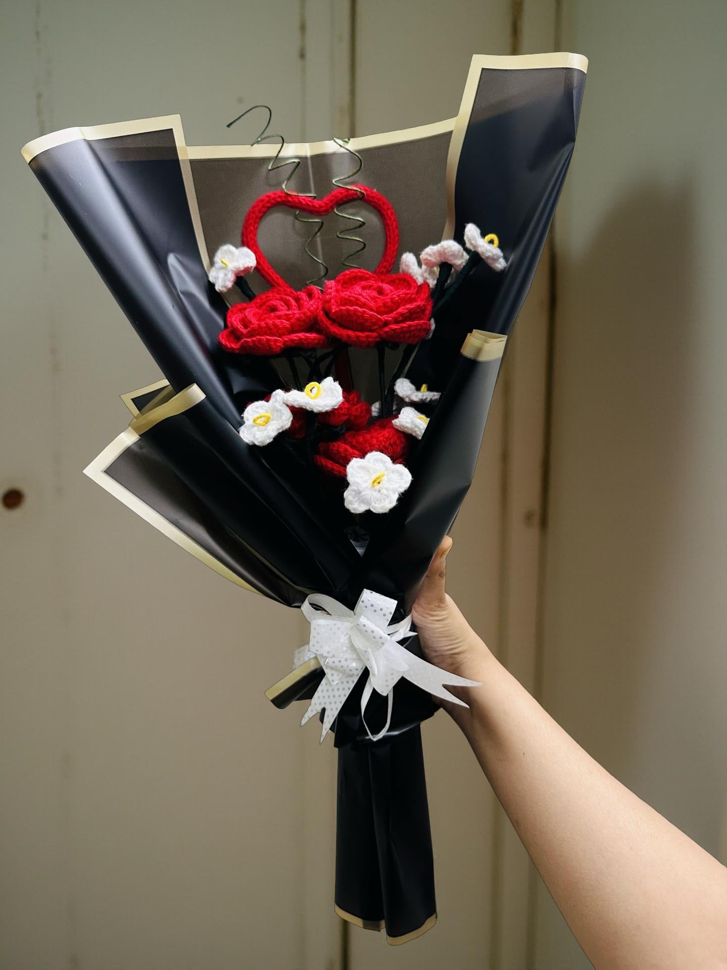 This handcrafted crochet bouquet features stunning red roses, delicate white lilies, and a heart accent – all wrapped in elegant black and gold wrap. Whether it’s for an anniversary, Valentine’s Day, birthday, or just to say “I love you,” this bouquet is the perfect timeless gesture.